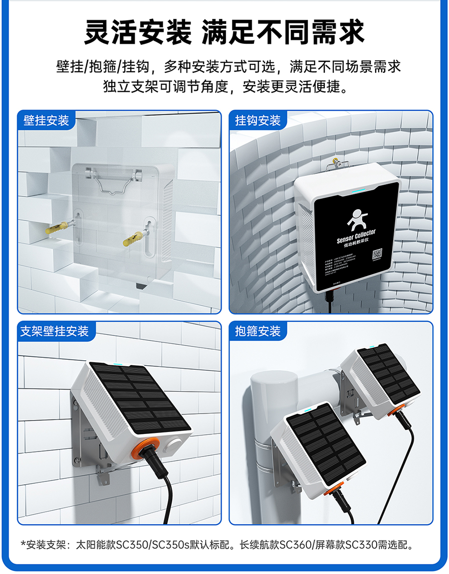 壁掛安裝、掛鉤安裝、支架安裝(定位孔加固)、抱箍安裝